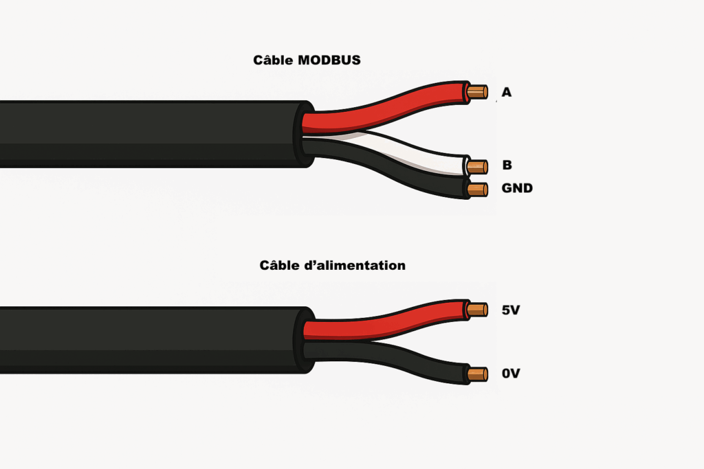 - Connecteur : RS485 – 3 bornes (A, B, GND)